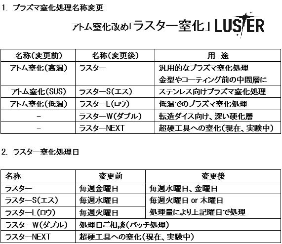 プラズマ窒化処理名称及び処理日程変更のお知らせ 2023-12-21 この度、弊社のプラズマ窒化処理においてアトム窒化から「ラスター窒化」への名称変更を致します。 前の記事« 「中小企業 新ものづくり・新サービス展」へ出展いたしました。 次の記事 PVDコーティング処理日変更のお知らせ »
