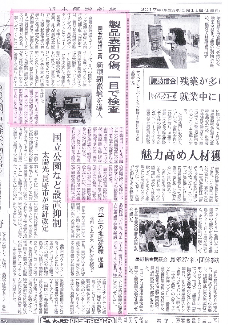 日本経済新聞に「製品表面の傷、一目で検査」が掲載されました! 2017-05-11 日本経済新聞2017.5.11(木)に当社の最新デジタルマイクロスコープ導入記事「製品表面の傷、一目で検査」が掲載されました。品質検査が従来に比べ向上し、製品の品質保証に貢献します。 掲載記事はこちら 前の記事« 中小企業技術革新制度(SBIR制度)に申請しました! 次の記事 PVDコーティングHCD法の処理可能な最大サイズが変更になります! »