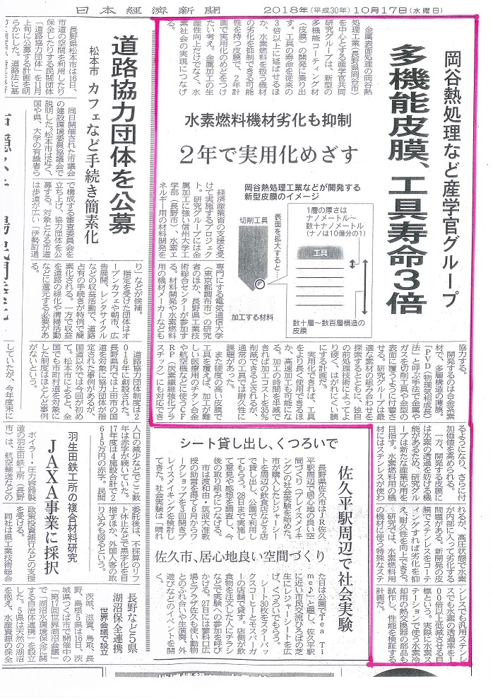 日本経済新聞に掲載されました!「革新的PVDコーティング皮膜」開発のため、産学官プロジェクトによるサポインが発足