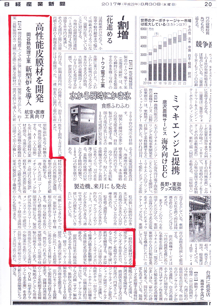 日経産業新聞2017年8月30日(水曜日)に「高性能皮膜材を開発」記事が掲載されました。